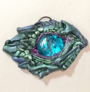 Since caning isn’t really my thing, the first thing I tried on break was a sculpted dragon’s eye. This was in Cernit Shiny Duck Green (gorgeous subtle mica shift color) with just a little pearlex on top. (Already sold during the class.)