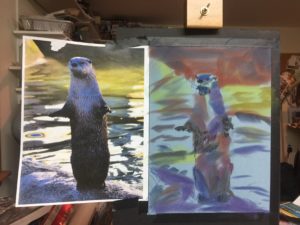 Here’s my latest. On the left is the reference photo I took at the Buttonwoods zoo. I literally have hundreds of otter photos – they’re just so much fun to watch.