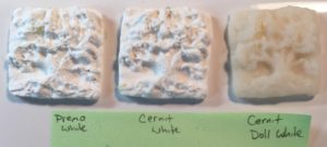So… Here’s me being all scientific and testing out the Cernit White vs Cernit Doll White vs some very fresh Premo White that I had ordered in the meantime.  I used a one inch mold from an oak tree sculpt I had done to see what each of them looks like.