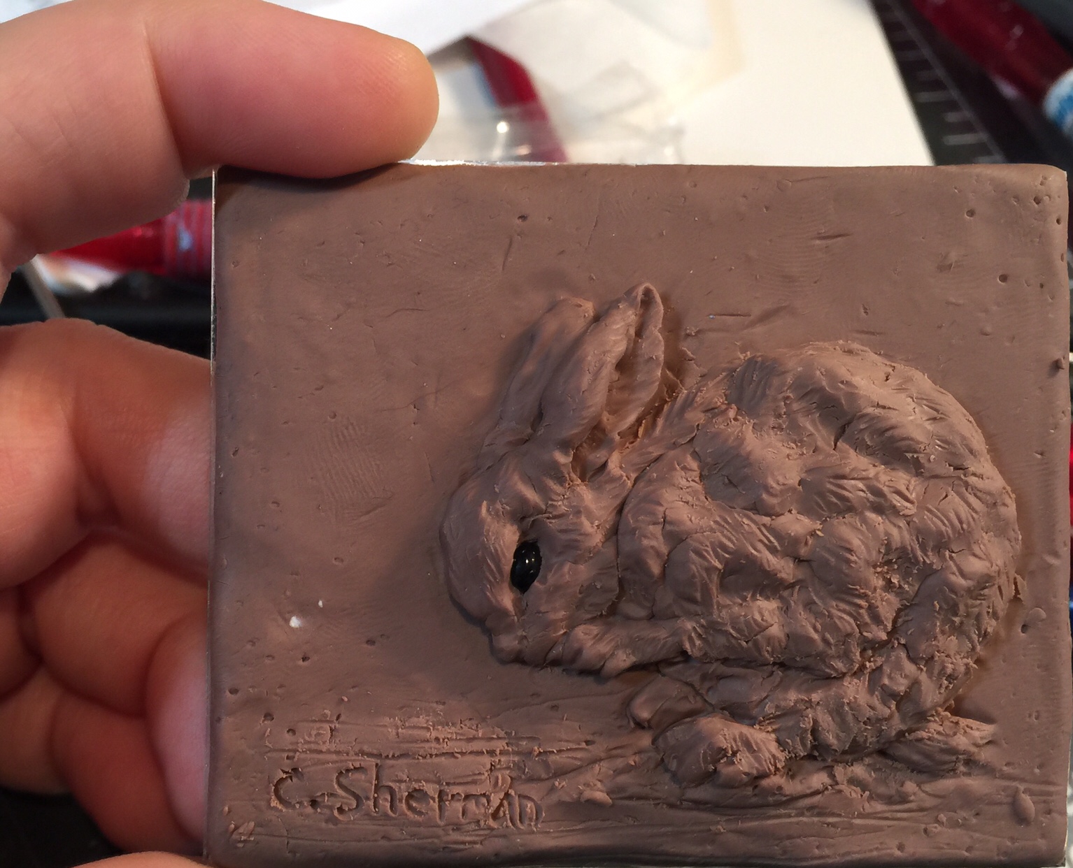 You may have heard the clay has a “shelf life” now. If I leave a relief sculpture for a week, I’ll come back, try to adjust a section and the clay will just break off instead of moving where I want it. Really not good when you have tiny sculptural details.
