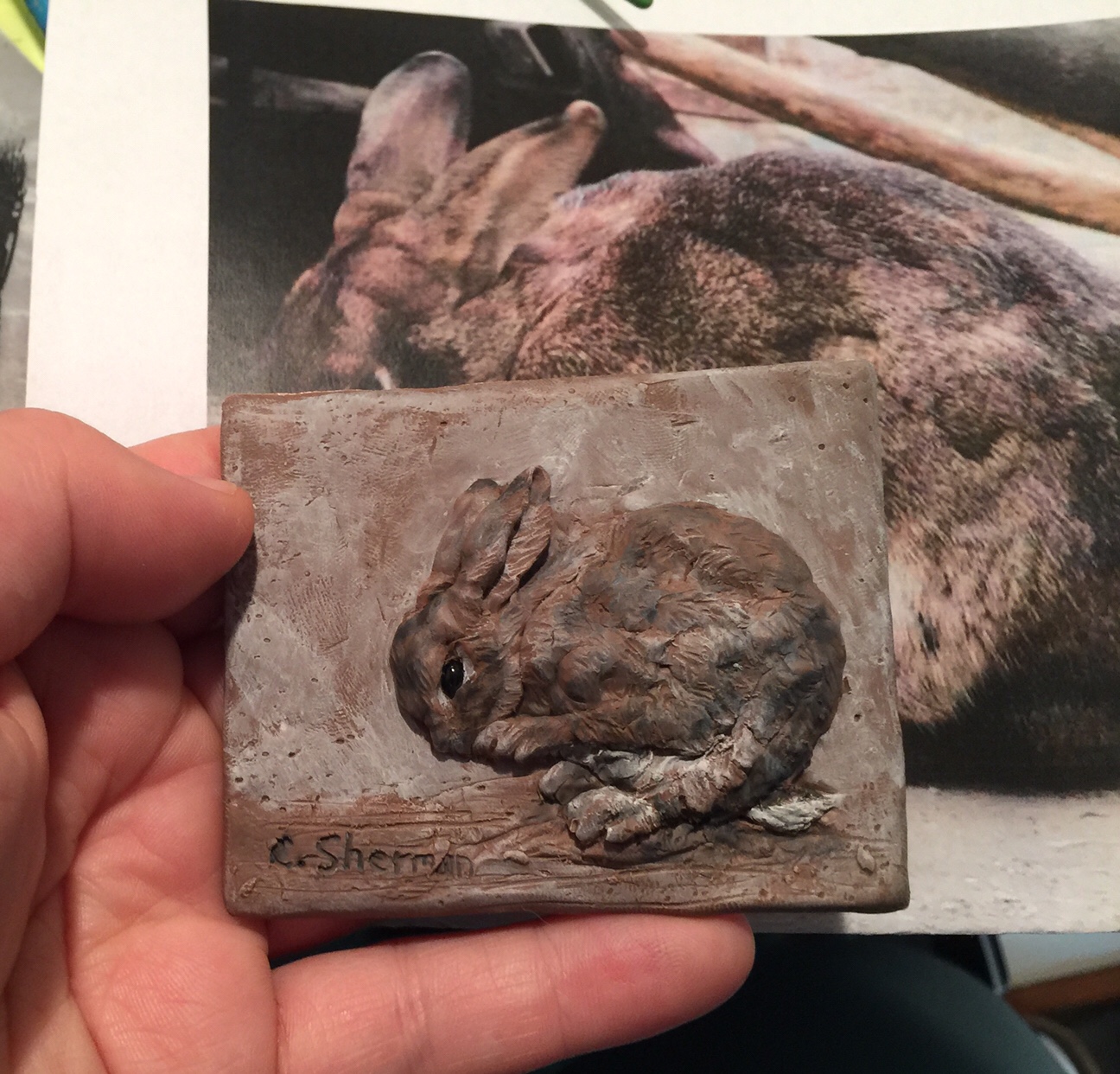 Marie sent me a block of taupe Cernit, which is this lovely soft brown with an almost purple undertone. It reminded me of a rabbit photo I’d taken a few years ago that I’ve wanted to sculpt.