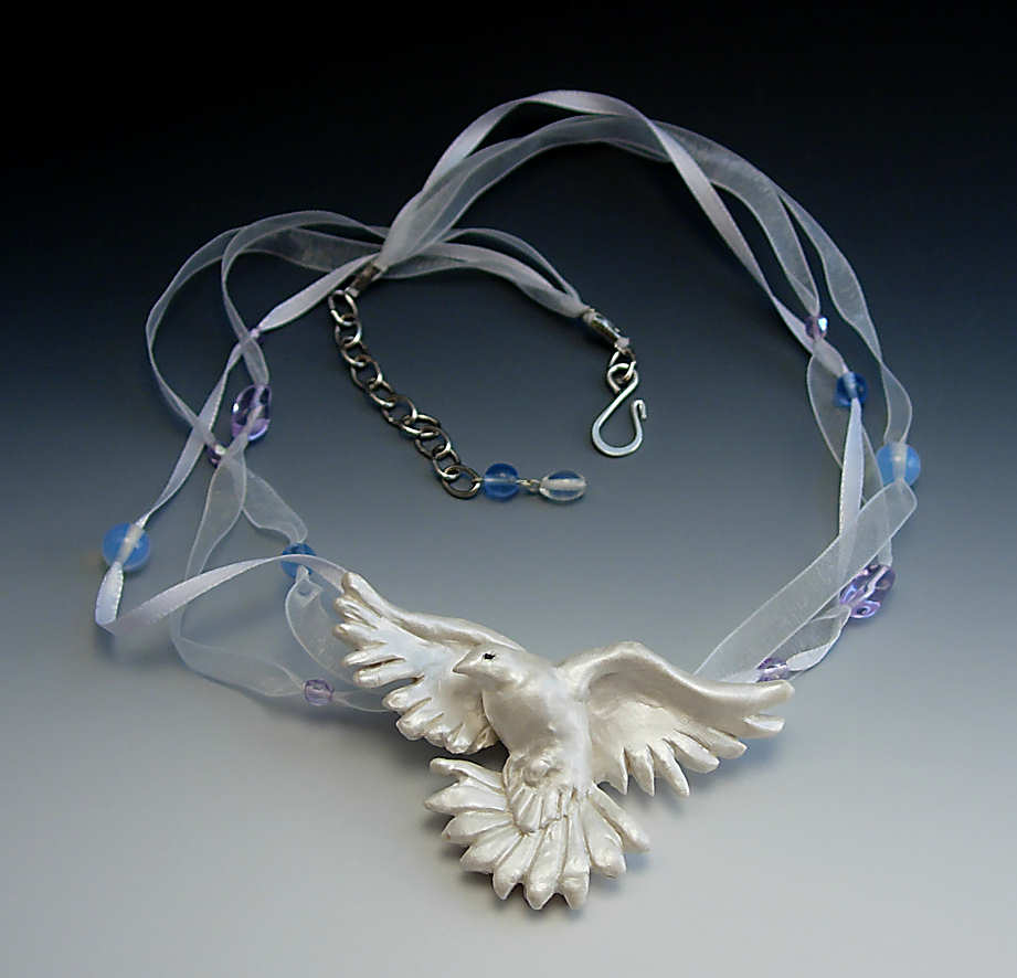 I sculpted the original dove, then press molded this one and highlighted it with white Pearlex. Its eye is a glass seed bead and it was given several coats of finish to protect the pearlex.