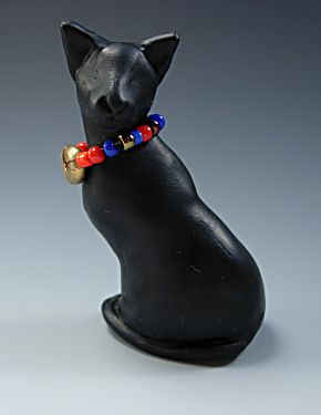 This is a regal looking cat based on an abyssinian. She will barely acknowledge lesser mortals such as us humans. She is wearing a necklace of seedbeads strung on very fine copper wire.