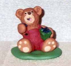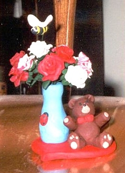 I made this bear for my aunt's anniversary. I made a dozen tiny roses and put stem wires into them before they were baked. Then I added a leaf or two to each rose and rebaked them. The wires were twisted together into an arrangement and put into a clay vase. The vase and bear were put on a red heart base. The bee also had a wire in it so it could be attached with the flowers