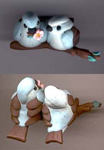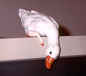 The watchful duck is sitting on top of my monitor and keeping an eye on the construction of this website. It has a foil core body and a toothpick in its neck for strength. Once it was baked, I gave it a coat of white acrylic paint to cover over the lint that white clay always seems to pick up. I also put a coat of Future floor wax on the eyes and beak to give them a gloss. I made a much smaller duck later on as a doodle.