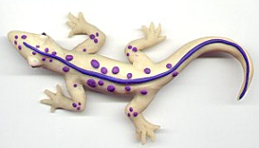 The body of this lizard was made with glow in the dark clay. It looks really neat in the dark since the spots and stripes of color show up as dark markings on the glowing lizard. The lizards eyeballs are also GITD clay with bands of black across them for the pupils.