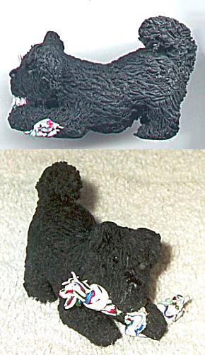 This is a model of my brother's dog. He's a scottish terrier mix. I was working from a photograph and trying to capture the look that Scotty always has when he wants you to play. I textured his fur with a needle tool and he has black seed beads for eyes. The rope I made from very thin strings of white and colored clay.